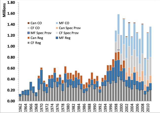Comprehensive Federal harvest surveys begin in the 1960s, which have provided valuable data for understanding the effects of hunting regulations on light goose harvests, patterns and changes in hunters and harvest distribution, and population dynamics of light geese. Federal harvest surveys consist of Diary/Questionnaire Surveys to estimate total goose harvest and Parts/Species Collection Surveys to…